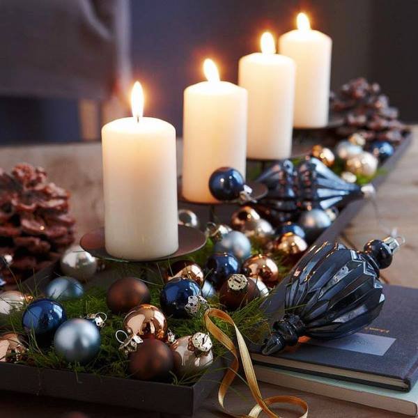 - spectacular New Year’s table decor can be created by several long candles on beautiful candlesticks placed in the center of the surface;