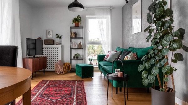 In the boho living room with a green sofa, decorations play an important role. Light-colored pillowcases made of natural fabrics, unusual pillows with ethnic patterns and strongly contrasting pillows in red, mustard or pink look good on a green sofa.