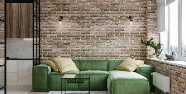 Functionality is important in a loft-style living room. Therefore, a large green corner sofa with a sleeping function is perfect – choose a model with a simple, geometric shape and let the color come out perfectly in front of a brick wall.