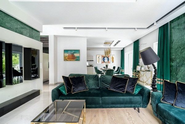 The green sofa in the Art Deco living room should be covered with beautiful velvet. You can place two or three decorative pillows in a contrasting color on the seat. For a glamorous effect, place a geometric table made of glass, metal or marble next to the sofa. A living room with a green sofa also needs atmospheric lighting, for example an elegant floor lamp or a fancy chandelier made of glass and metal.